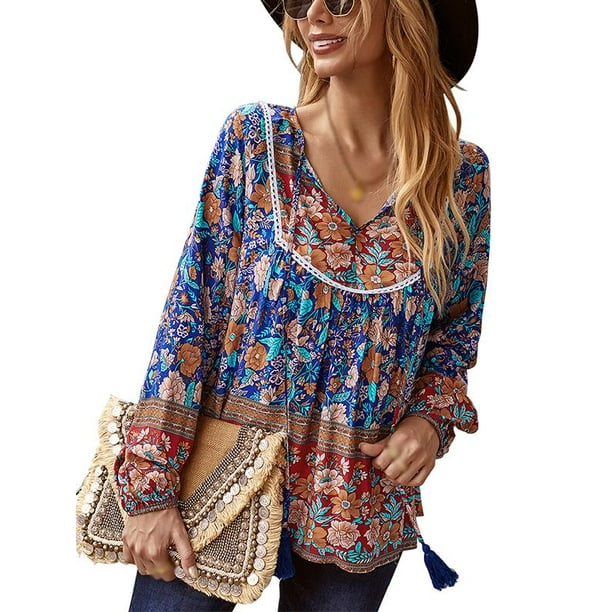 Marinavida Women S Floral Boho Tunic Tops Casual Long Sleeve Loose Beach Blouses Self Tie V Neck T Shirts Walmart Com